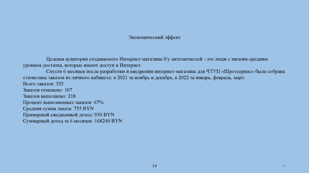 Экономический эффектЦелевая аудитория создаваемого Интернет-магазина б/у автозапчастей - это люди с низким-средним