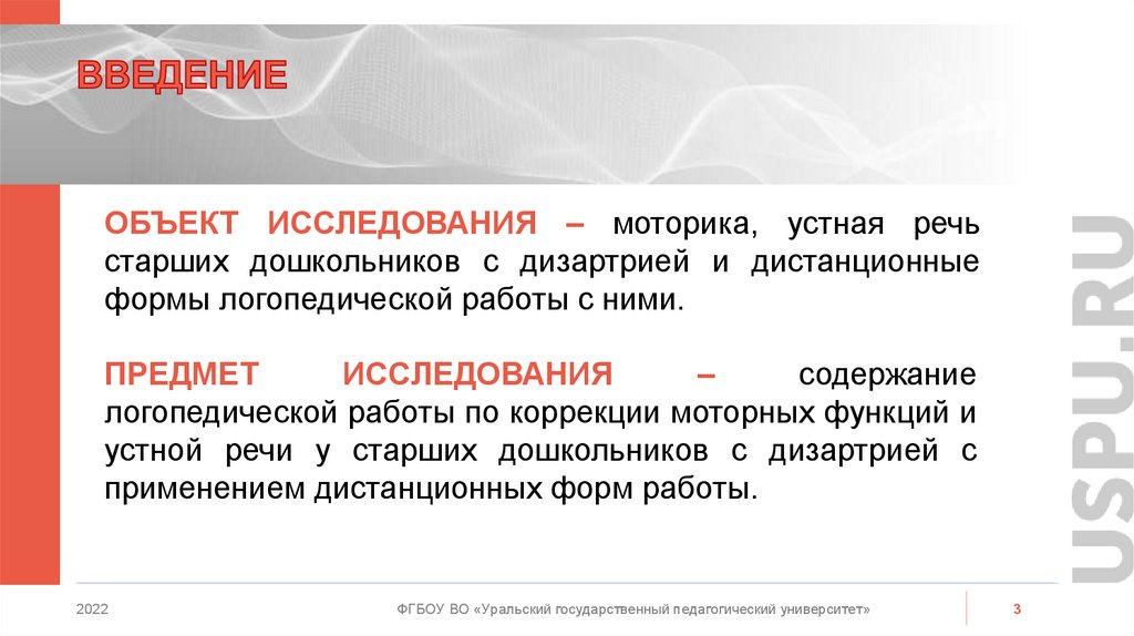 ОБЪЕКТ ИССЛЕДОВАНИЯ – моторика, устная речьстарших дошкольников с дизартрией и дистанционные