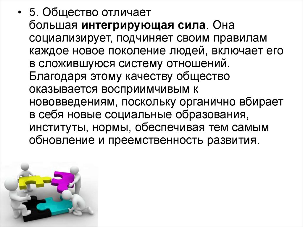 • 5. Общество отличаетбольшая интегрирующая сила. Она