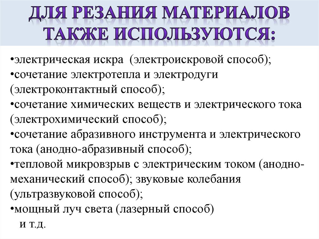 •электрическая искра (электроискровой способ);•сочетание электротепла и электродуги