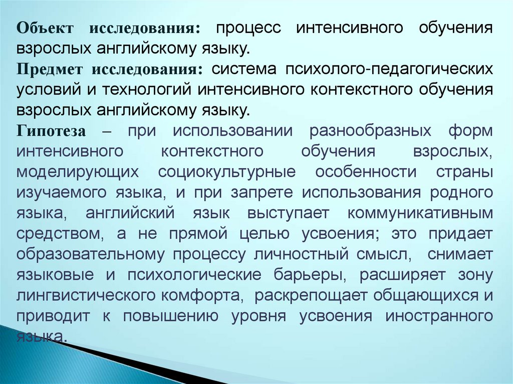 Объект исследования: процесс интенсивного обучениявзрослых английскому языку.