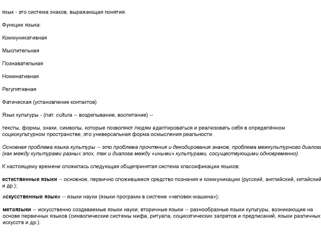Язык культуры - (лат. cultura -- возделывание, воспитание) -тексты, формы, знаки, символы, которые позволяют людям адаптироваться и реализовать себя в определённом