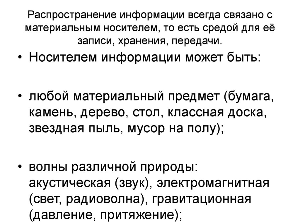 Распространение информации всегда связано сматериальным носителем, то есть средой для её