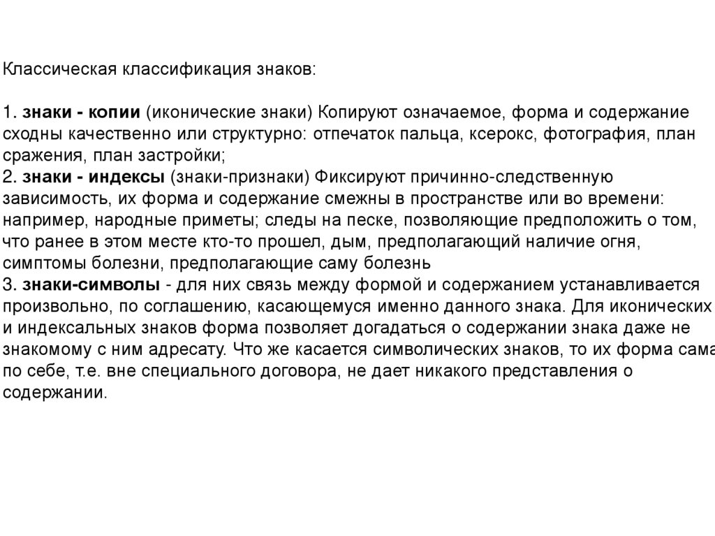 Классическая классификация знаков:1. знаки - копии (иконические знаки) Копируют означаемое, форма и содержание