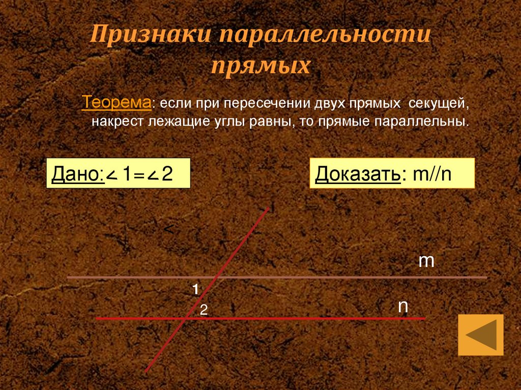 накрест лежащие углы равны, то прямые параллельны.