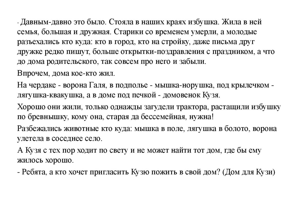 На чердаке - ворона Галя, в подполье - мышка-норушка, под крылечком лягушка-квакушка, а в доме под печкой - домовенок Кузя.