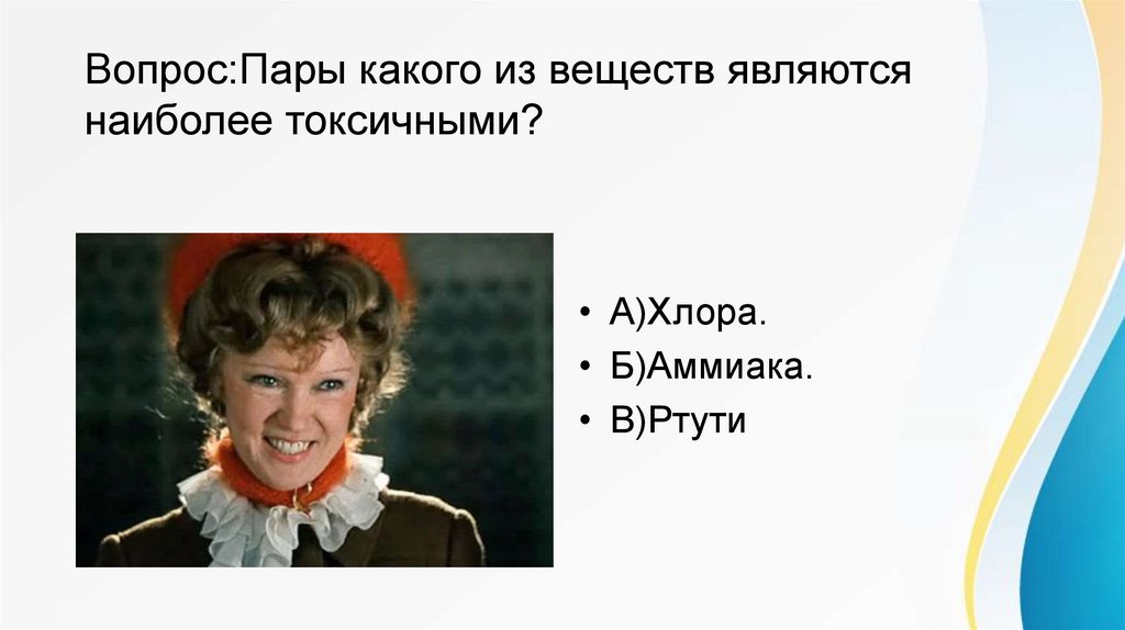 Вопрос:Пары какого из веществ являютсянаиболее токсичными?
