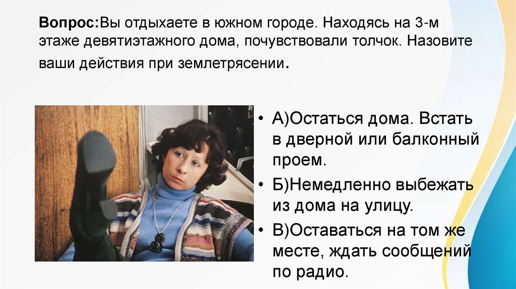 Вопрос:Вы отдыхаете в южном городе. Находясь на 3-мэтаже девятиэтажного дома, почувствовали толчок. Назовите