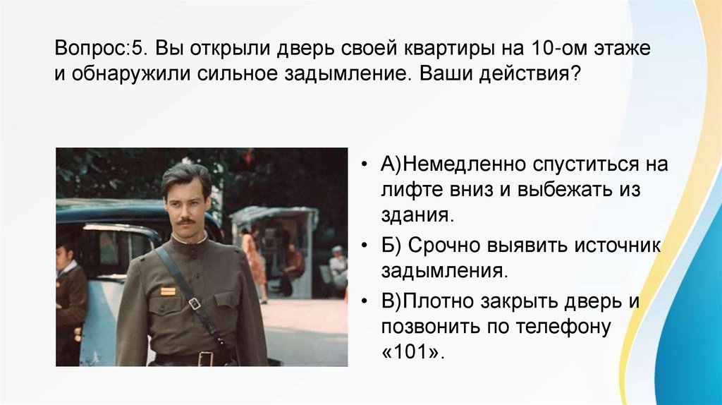 Вопрос:5. Вы открыли дверь своей квартиры на 10-ом этажеи обнаружили сильное задымление. Ваши действия?
