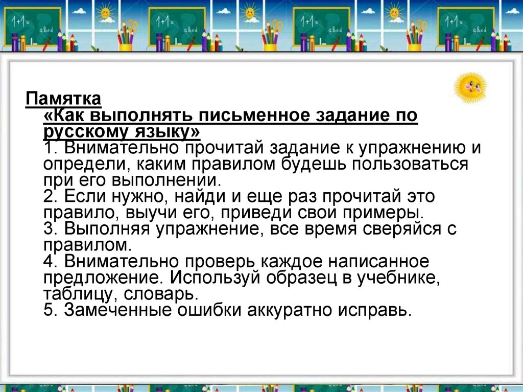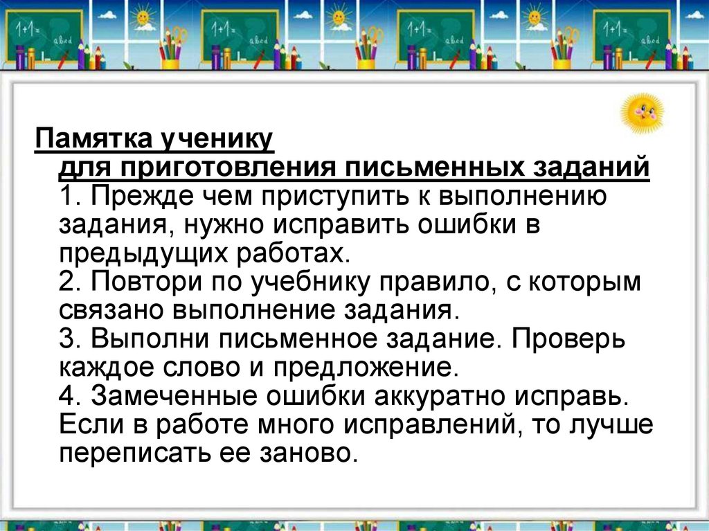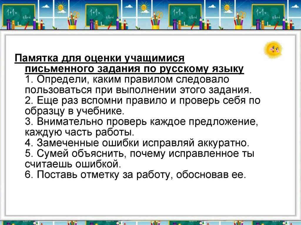 Памятка для оценки учащимисяписьменного задания по русскому языку