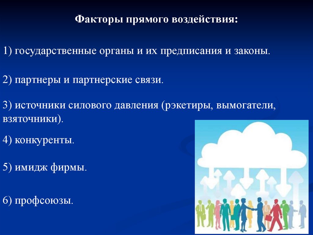 Факторы прямого воздействия:1) государственные органы и их предписания и законы.