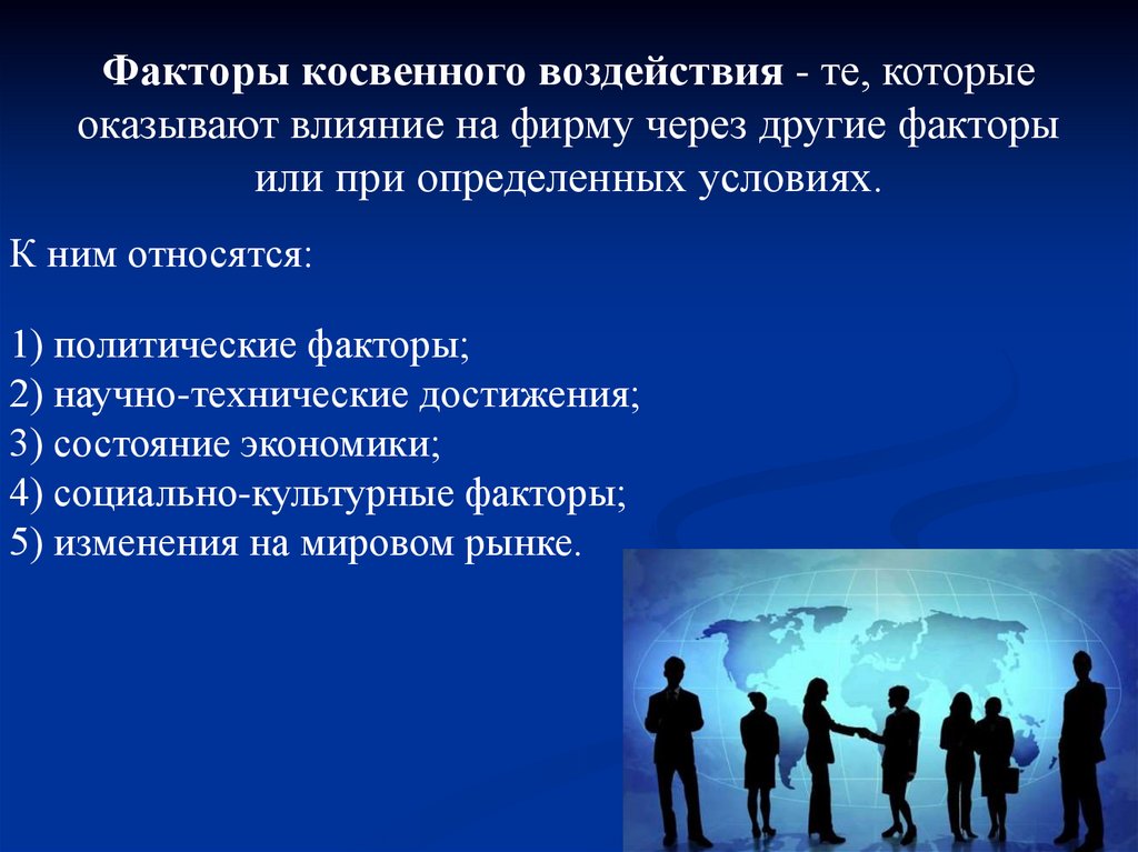 Факторы косвенного воздействия - те, которыеоказывают влияние на фирму через другие факторы