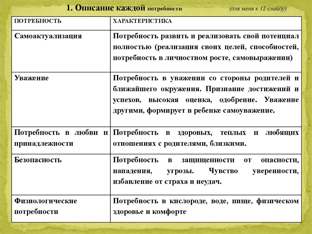 1. Описание каждой потребности(для меня к 12 слайду)