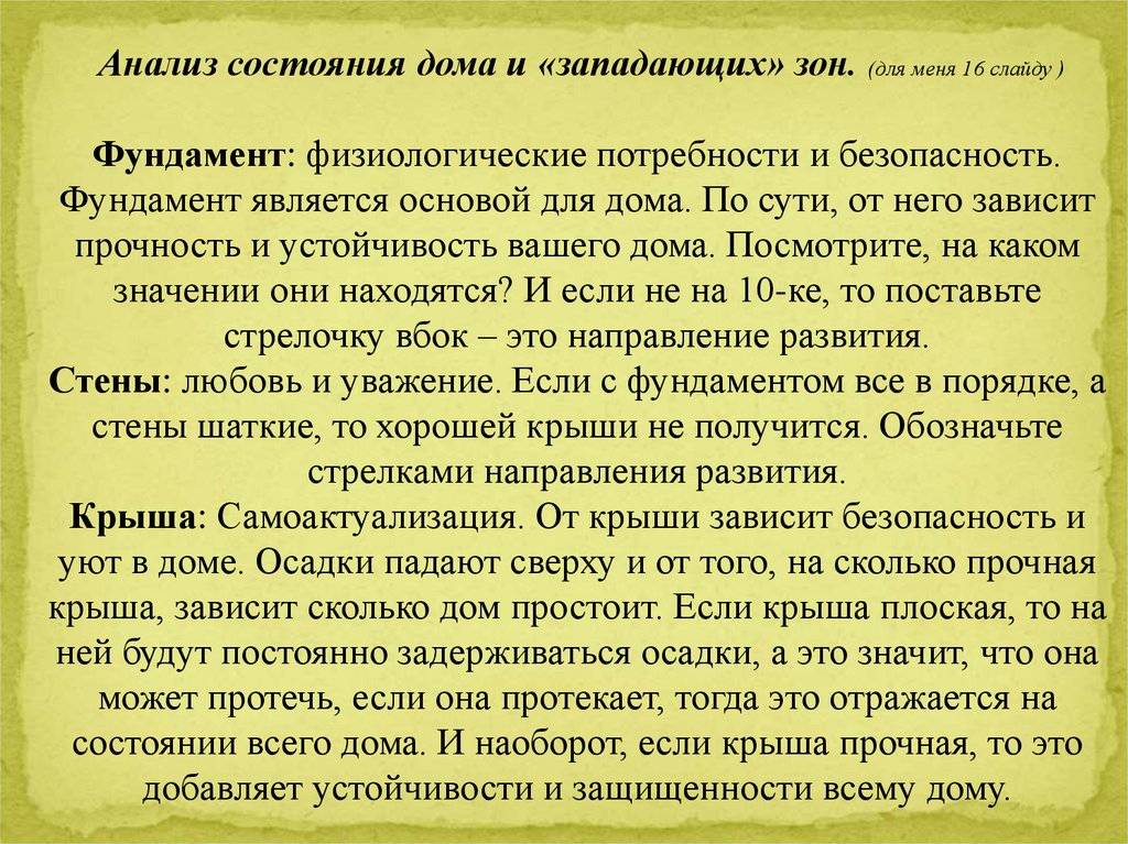 Анализ состояния дома и «западающих» зон. (для меня 16 слайду )Фундамент: физиологические потребности и безопасность.