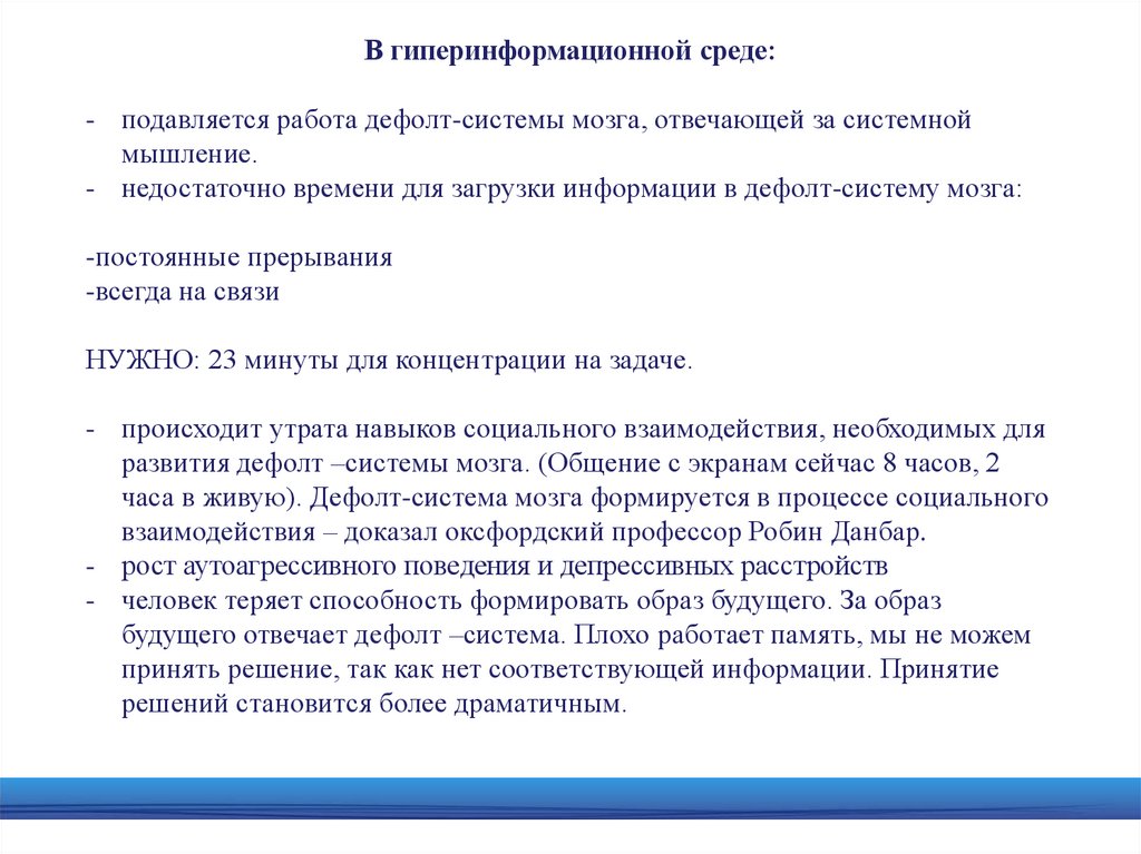 В гиперинформационной среде:- подавляется работа дефолт-системы мозга, отвечающей за системной