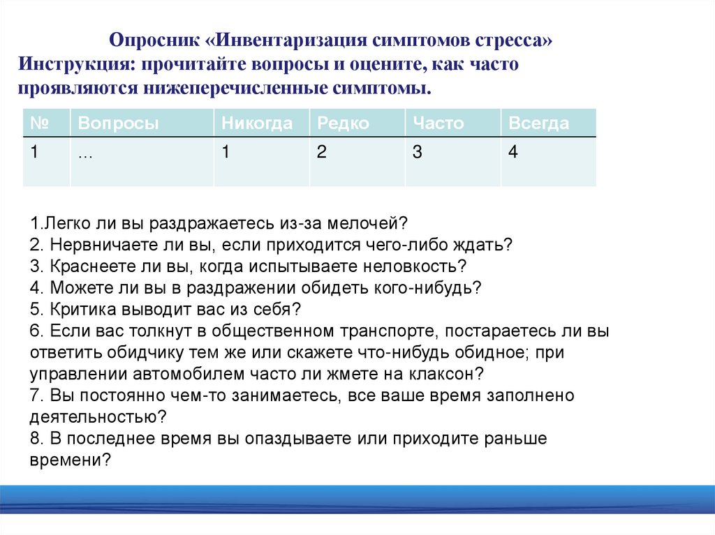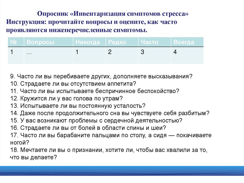 Опросник «Инвентаризация симптомов стресса»Инструкция: прочитайте вопросы и оцените, как часто