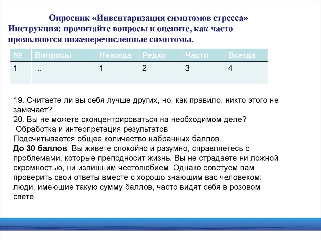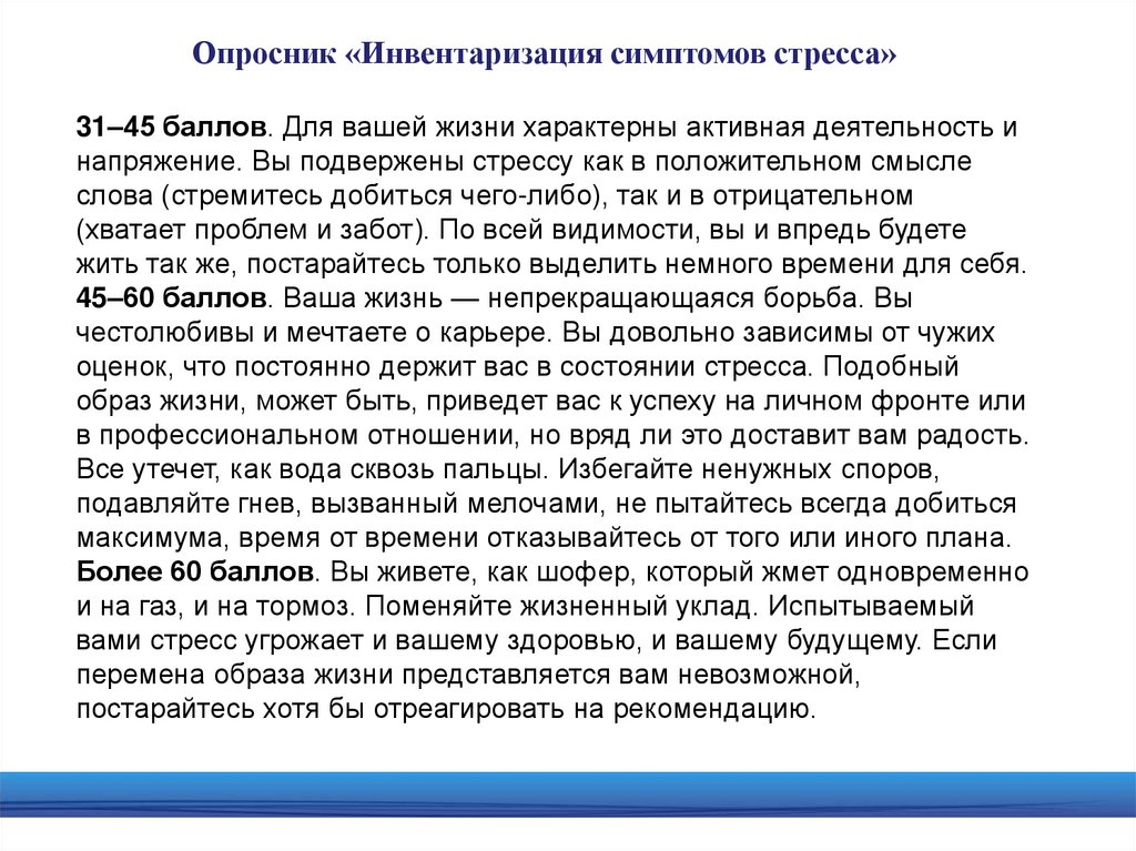 Опросник «Инвентаризация симптомов стресса»31–45 баллов. Для вашей жизни характерны активная деятельность и