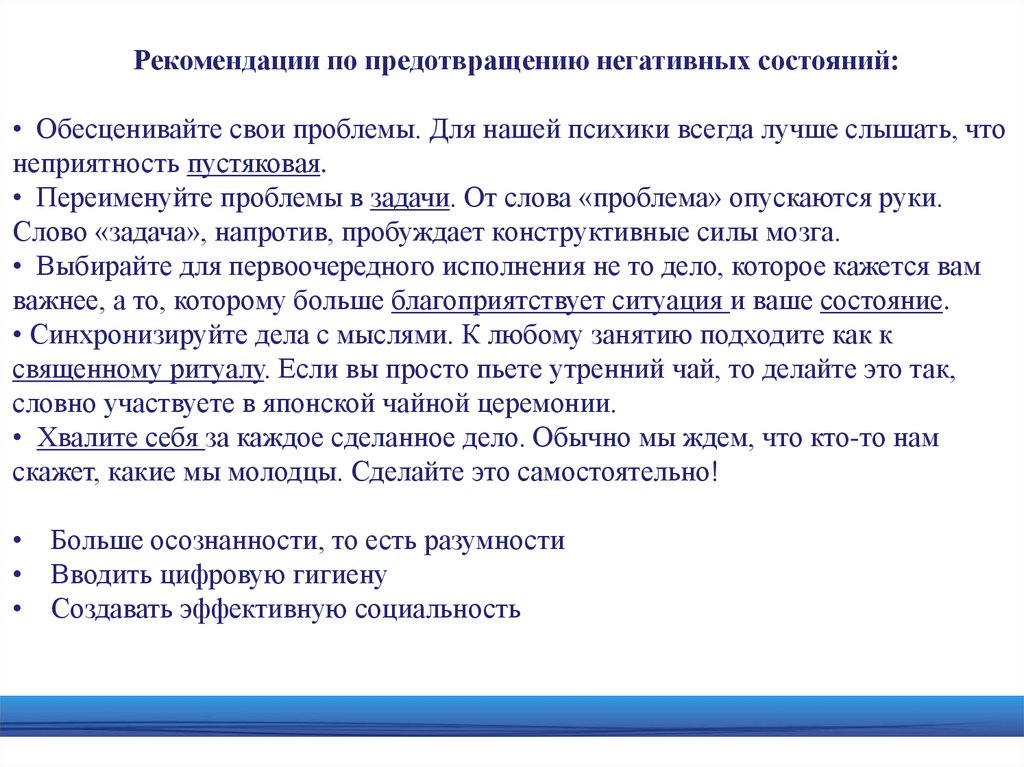 Рекомендации по предотвращению негативных состояний:• Обесценивайте свои проблемы. Для нашей психики всегда лучше слышать, что