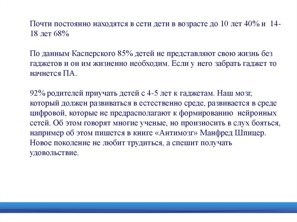 Почти постоянно находятся в сети дети в возрасте до 10 лет 40% и 1418 лет 68%По данным Касперского 85% детей не представляют свою жизнь без