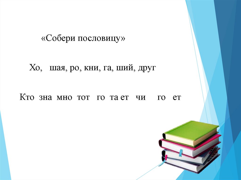 «Собери пословицу»Хо, шая, ро, кни, га, ший, друг