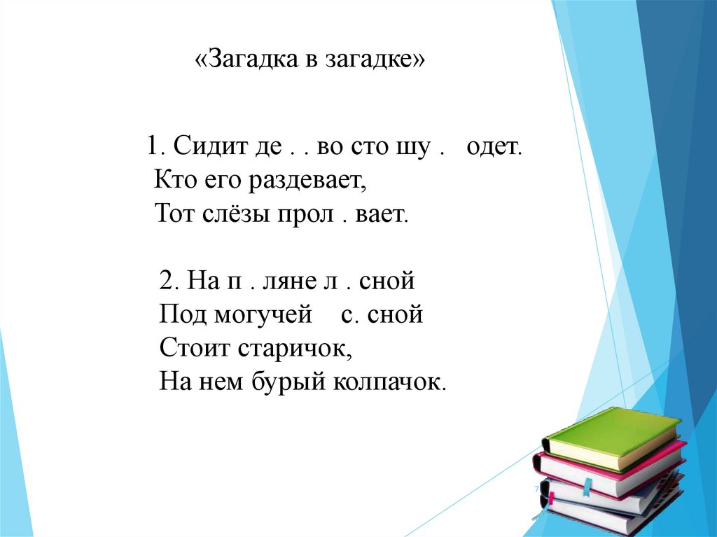 «Загадка в загадке»1. Сидит де . . во сто шу . одет.