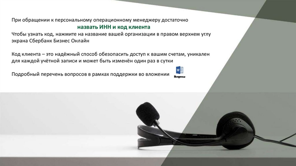 При обращении к персональному операционному менеджеру достаточноназвать ИНН и код клиента