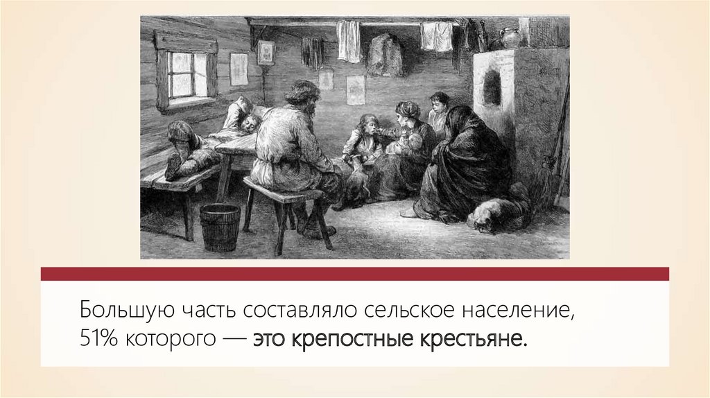 Большую часть составляло сельское население,51% которого — это крепостные крестьяне.