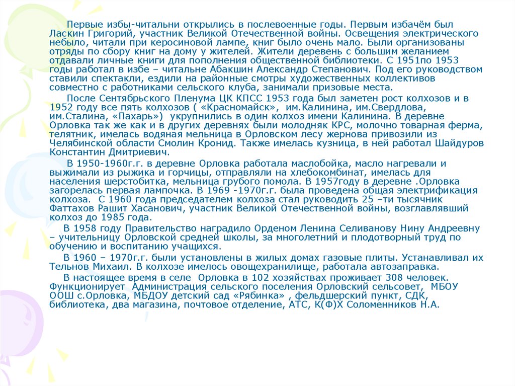 Первые избы-читальни открылись в послевоенные годы. Первым избачём былЛаскин Григорий, участник Великой Отечественной войны. Освещения электрического