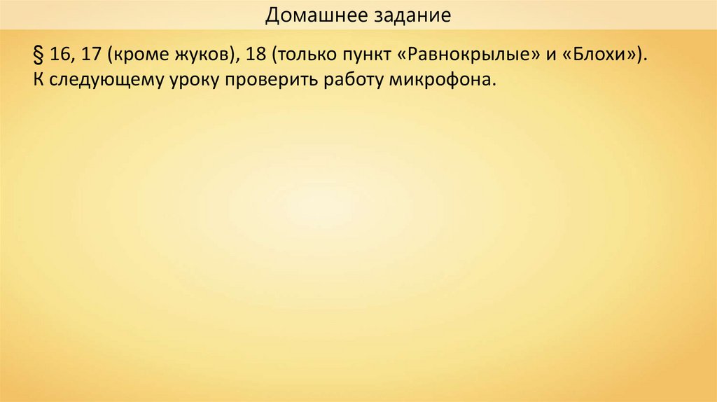 Домашнее задание§ 16, 17 (кроме жуков), 18 (только пункт «Равнокрылые» и «Блохи»).