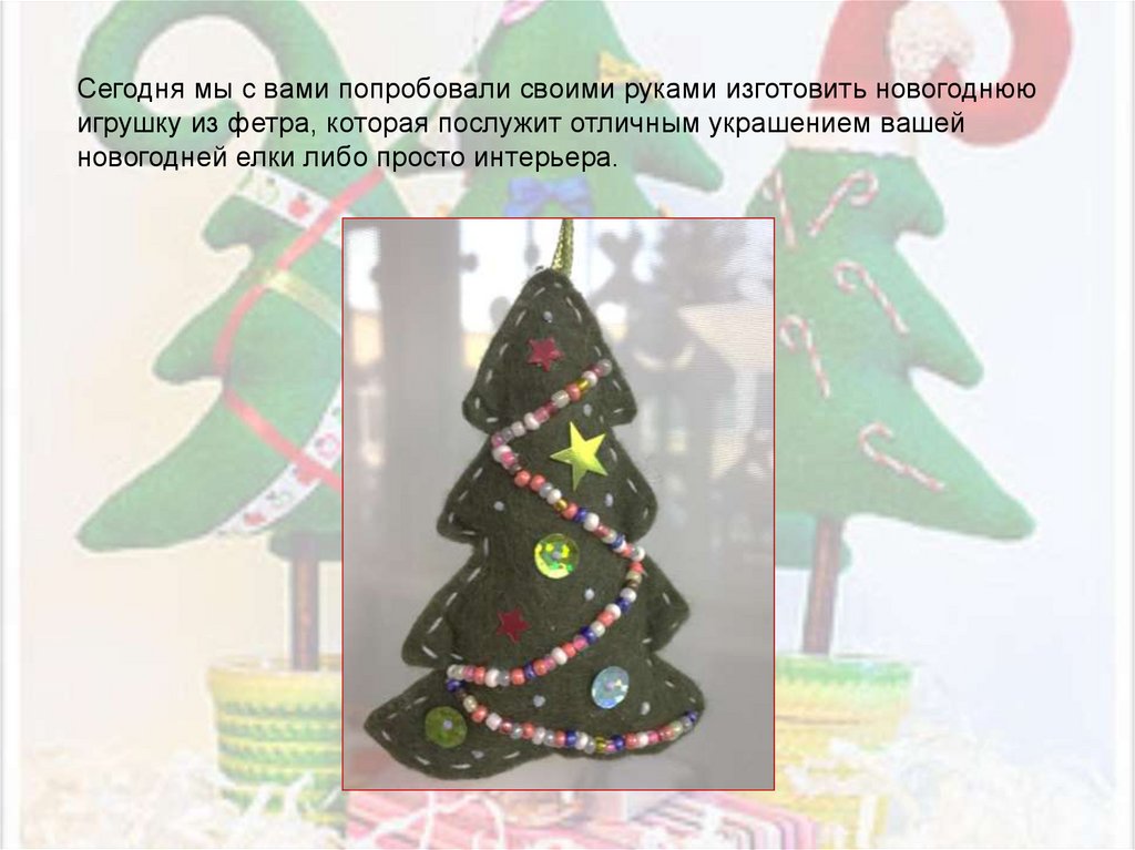 Сегодня мы с вами попробовали своими руками изготовить новогоднююигрушку из фетра, которая послужит отличным украшением вашей