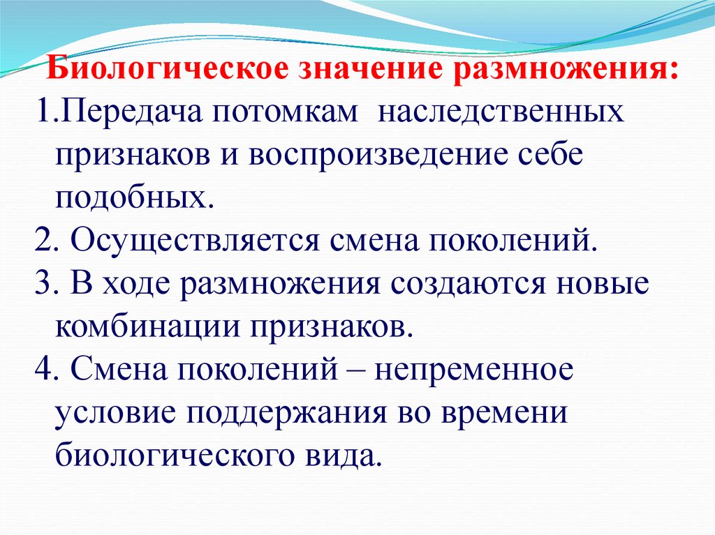 Биологическое значение размножения:1.Передача потомкам наследственных