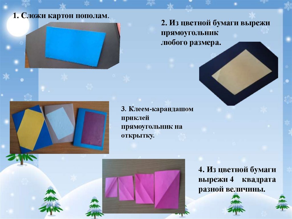 1. Сложи картон пополам.2. Из цветной бумаги вырежи