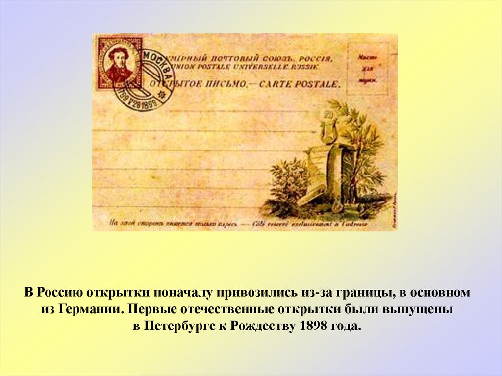 В Россию открытки поначалу привозились из-за границы, в основномиз Германии. Первые отечественные открытки были выпущены