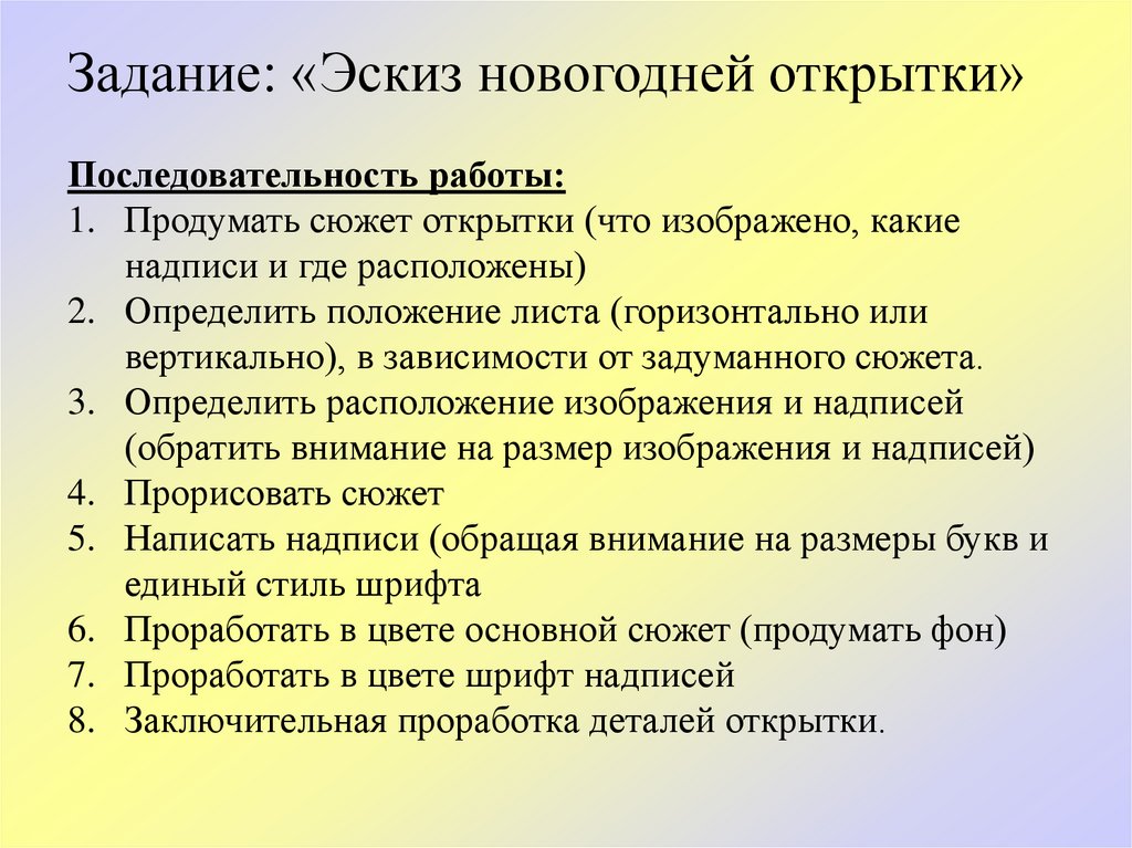 Задание: «Эскиз новогодней открытки»Последовательность работы: