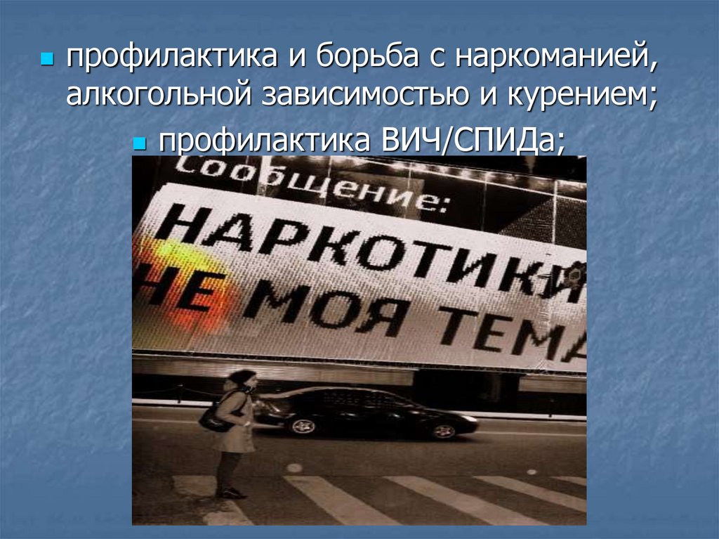 профилактика и борьба с наркоманией,алкогольной зависимостью и курением;