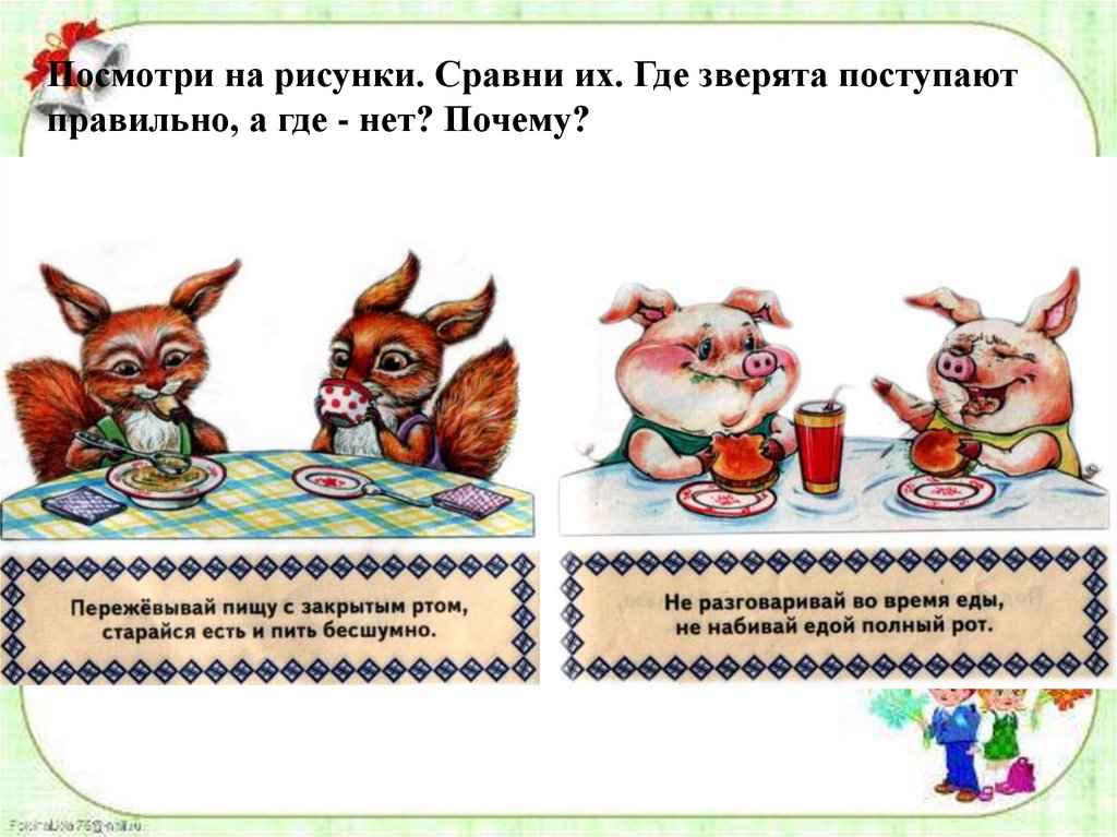 Посмотри на рисунки. Сравни их. Где зверята поступаютправильно, а где - нет? Почему?