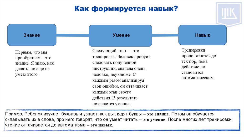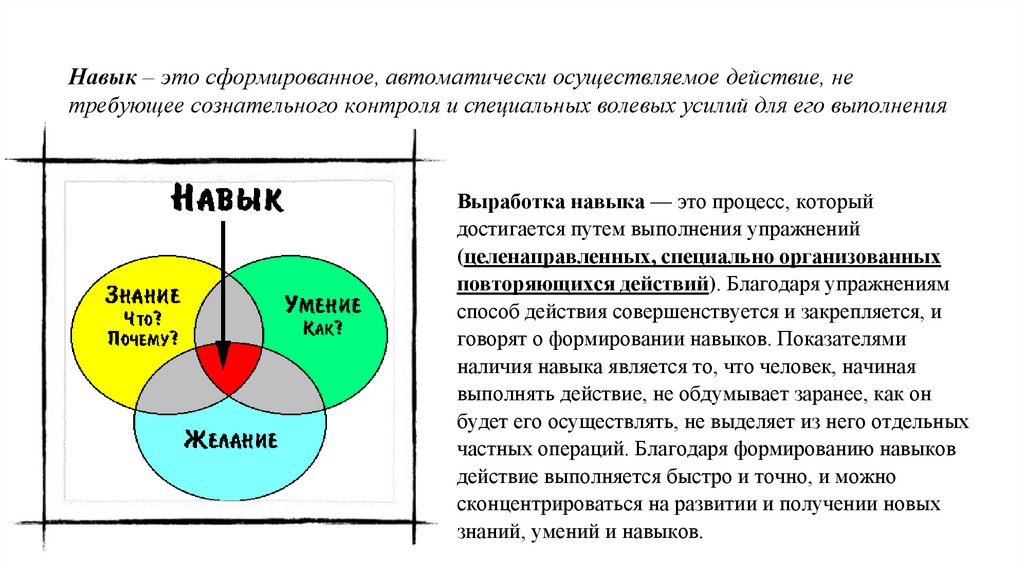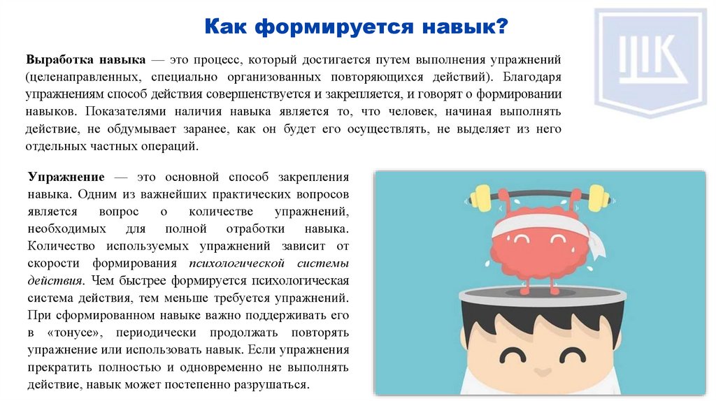 Как формируется навык?Выработка навыка — это процесс, который достигается путем выполнения упражнений