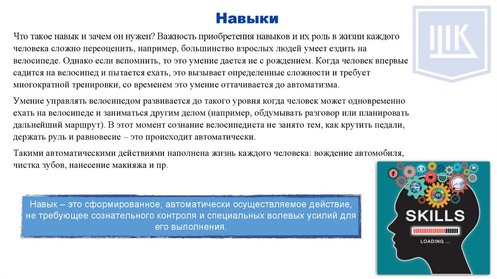 навыков. Показателями наличия навыка является то, что человек, начиная выполнять