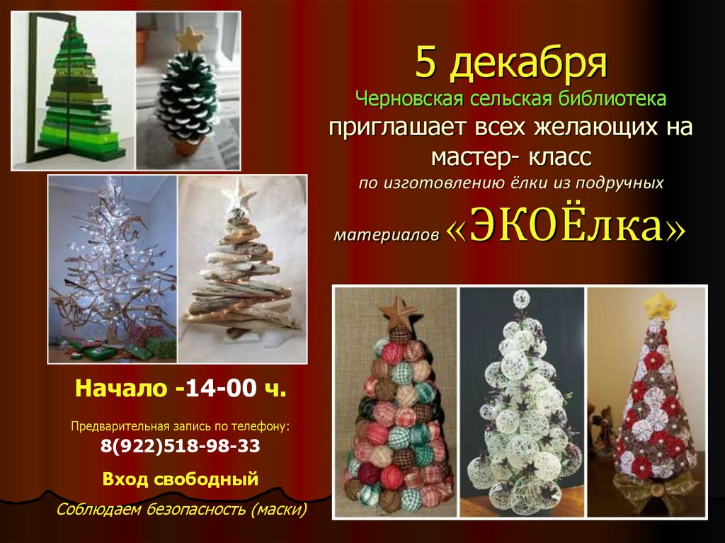 1. 5 декабря Черновская сельская библиотека приглашает всех желающих на мастер- класс по изготовлению ёлки из подручных материалов