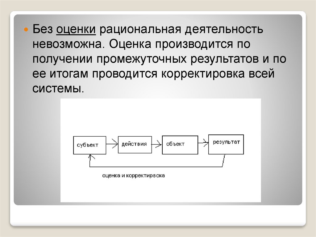 Без оценки рациональная деятельностьневозможна. Оценка производится по