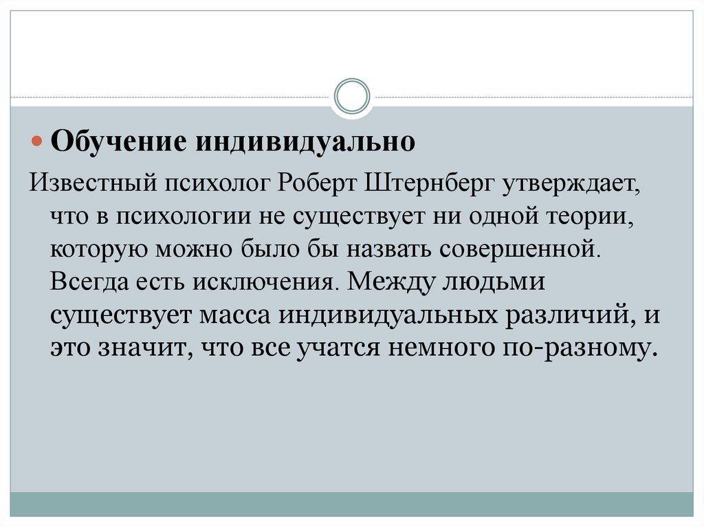 Обучение индивидуальноИзвестный психолог Роберт Штернберг утверждает,