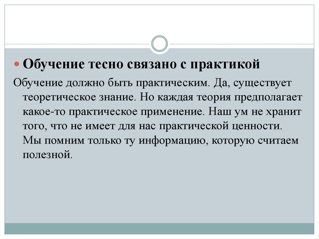 Обучение тесно связано с практикойОбучение должно быть практическим. Да, существует