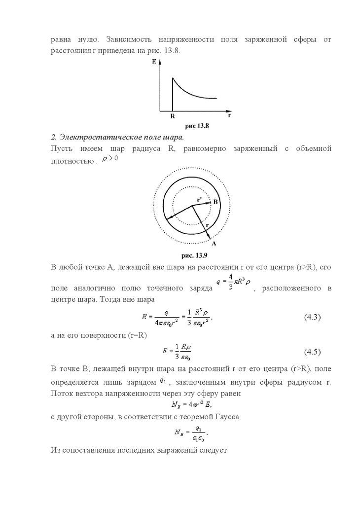 равна нулю. Зависимость напряженности поля заряженной сферы отрасстояния r приведена на рис. 13.8.