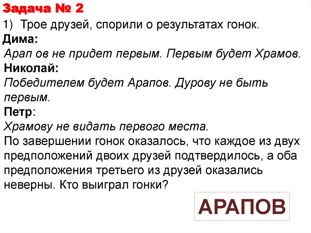 Задача № 21) Трое друзей, спорили о результатах гонок.