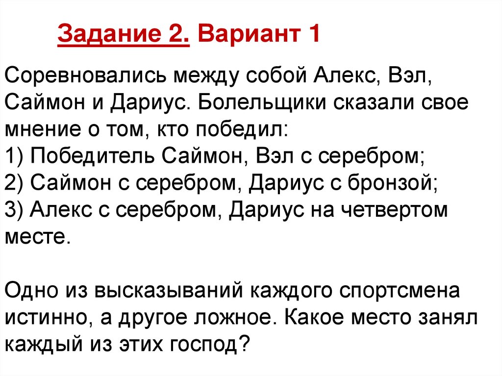 Задание 2. Вариант 1Соревновались между собой Алекс, Вэл,