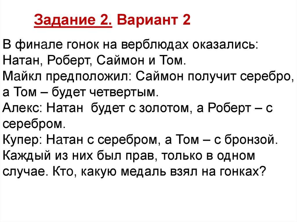 Задание 2. Вариант 2В финaле гонок на верблюдaх оказались: