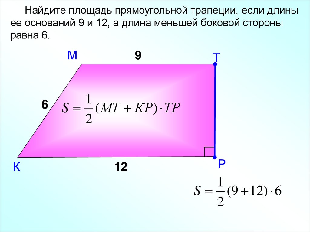Найдите площадь прямоугольной трапеции, если длиныее оснований 9 и 12, а длина меньшей боковой стороны