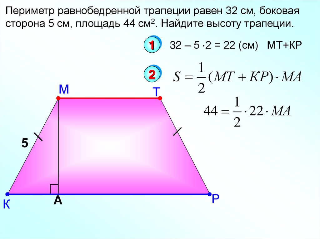 Периметр равнобедренной трапеции равен 32 см, боковаясторона 5 см, площадь 44 см2. Найдите высоту трапеции.