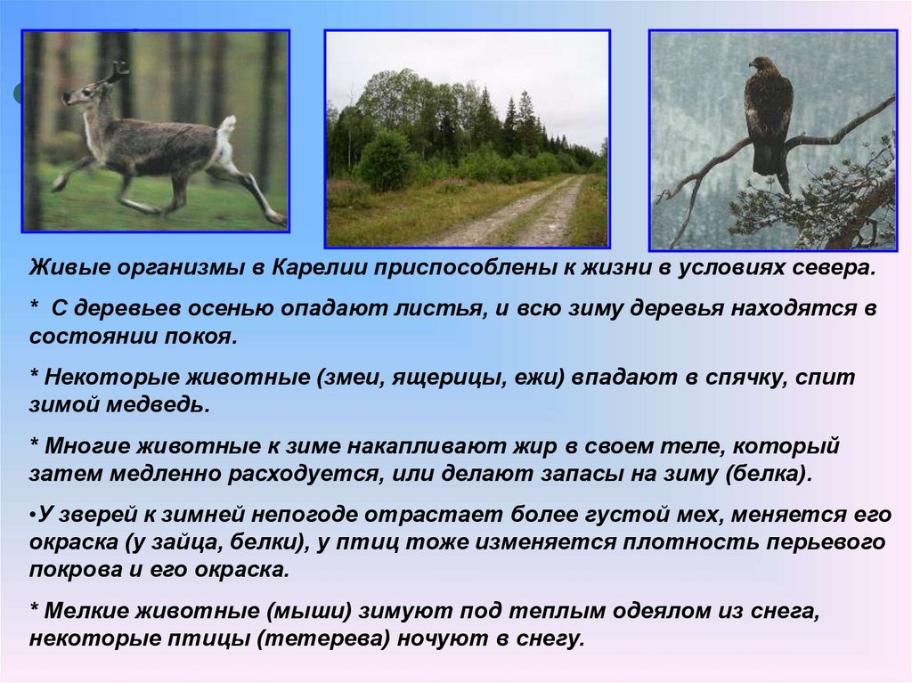 Живые организмы в Карелии приспособлены к жизни в условиях севера.* С деревьев осенью опадают листья, и всю зиму деревья находятся в