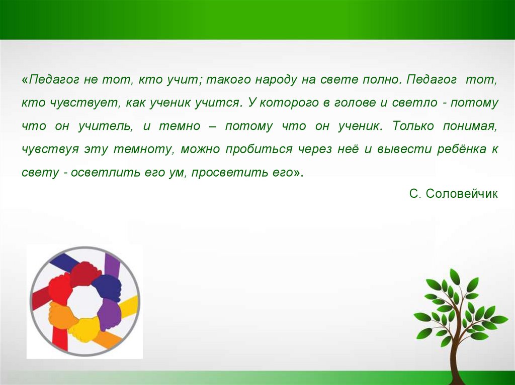 «Педагог не тот, кто учит; такого народу на свете полно. Педагог тот,кто чувствует, как ученик учится. У которого в голове и светло - потому